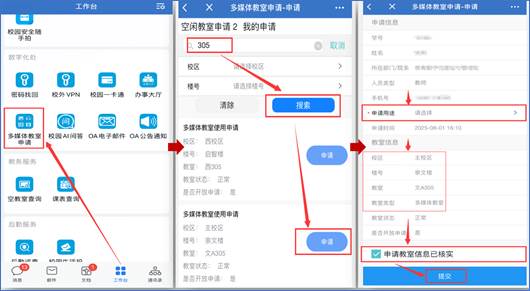企业微信→工作台→多媒体教室申请→输入教室号搜索→确认需要申请的教室→申请→仔细阅读提示信息,并点击“已知晓”→选择申请用途→勾选申请教室信息已核实→提交。