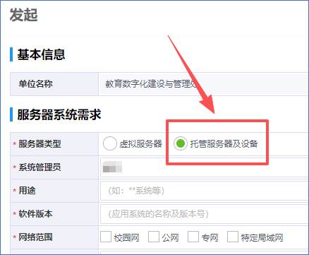 3、在【发起】页面中,服务器类型选择“托管服务器及设备”,并按提示填写相关信息,确认无误后,点击“启动”发起流程审批。