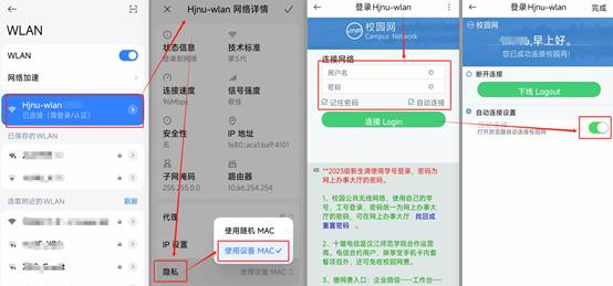 ①Android设备:打开WiFi,找到“Hjnu-wlan”→在Hjnu-wlan网络详情页的隐私中选择“使用设备MAC”→在弹出的“登录Hjnu-wlan”页中输入学/工号和密码(与统一身份认证登录密码一样)→点击“连接Login”提示“欠费”→关闭WiFi;