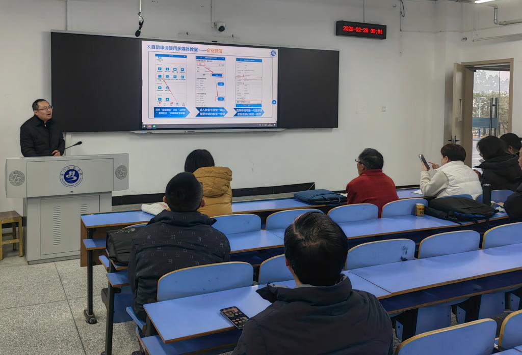 上午的培训在崇文楼A313开展,教育数字化建设与管理处副处长张炳围绕多媒体设备实操应用展开讲解,重点介绍了多媒体教室设备的规范开关流程、“多媒体教室申请”平台的操作方法,详细梳理了设备使用各类注意事项,包括设备自动开关时间规则、中控面板正确操作方式、设备使用后的规范关闭要求等,全面讲解了主要多媒体设备的核心使用要点。