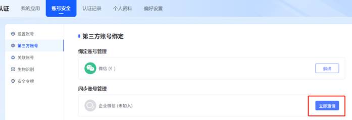 个人中心——账号安全——第三方账号——企业微信:立即解绑——邮箱收到验证码,并填写(没有绑定邮箱,请先操作步骤三)——解绑成功后会显示“企业微信(未加入)”,此时点击“立即邀请”